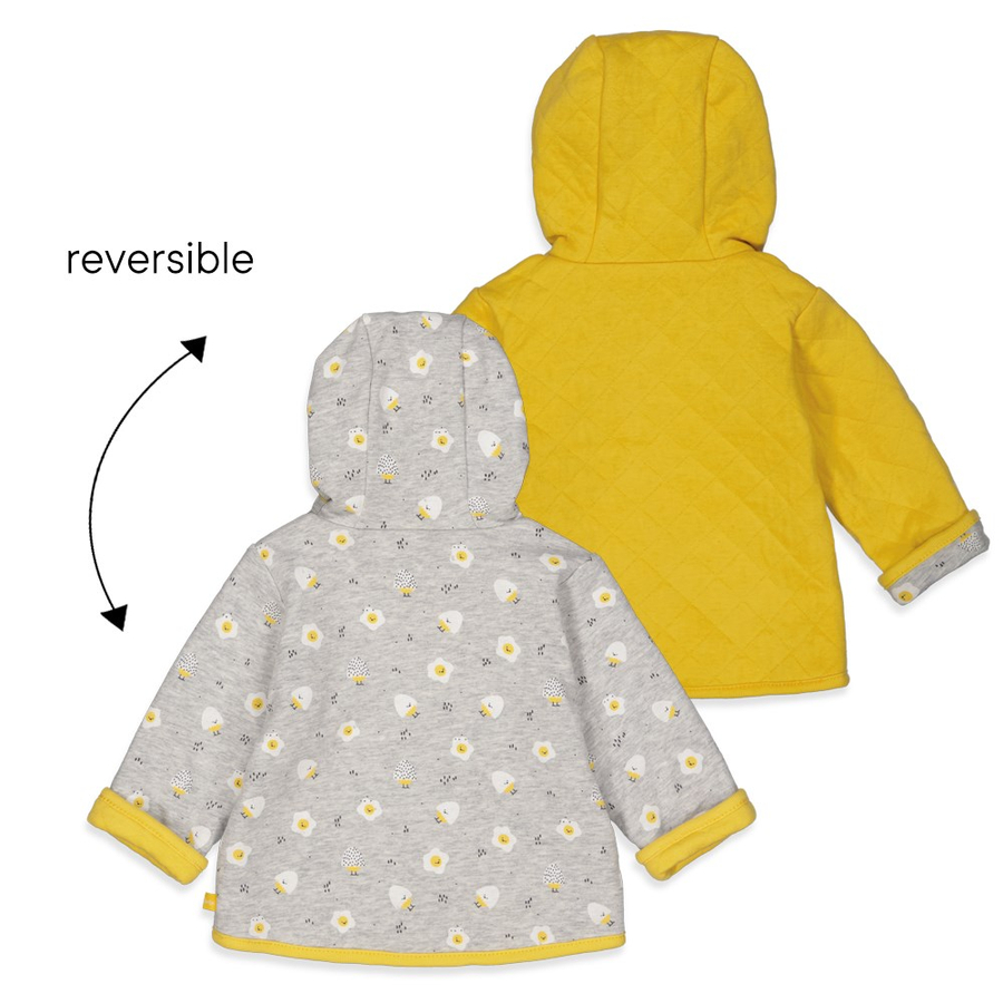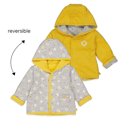 Dettagli del prodotto: Giacca reversibile con cappuccio 1° lato: grigio con stampa allover, tasca decorativa 2° lato: giallo, look trapuntato, motivo ricamato Con bottoni a pressione Polsini morbidi Materiale e cura: Materiale: 96% cotone biologico, 4% elastan;
