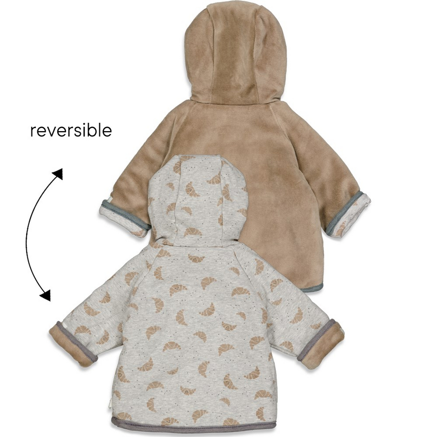 L'azienda olandese Feetje vi offre una selezione colorata di Design s alla moda in super qualità - e il tutto arrotondato ad un prezzo giusto. Una varietà divertente di grandi collezioni - sempre combinabili in modi nuovi. Bella giacca reversibile con cappuccio con due diversi Design s. Un lato presenta un simpatico croissant Allover print e l'altro lato è fatto di morbido pile vellutato. È rifinito con finiture grigie e un'abbottonatura con bottoni a pressione per indossarlo e toglierlo facilmente. Entrambi i lati hanno un look fresco e sono ideali per essere combinati con diversi abiti. Dettagli del prodotto: Giacca reversibile per ragazzi Con cappuccio 1° lato: croissant- Allover print 2° lato: pile Bordo grigio Abbottonatura con bottoni a pressione Materiale e cura: Materiale: 80% cotone, 20& poliestere Lavabile fino a 40 °C