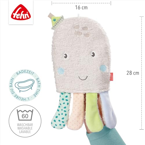 Fehn 054576 Guanto spugna a forma di polpo, panno spugna con figure di animali per un allegro divertimento durante il bagno, per neonati e bambini da 0+ mesi, dimensioni 25 cm