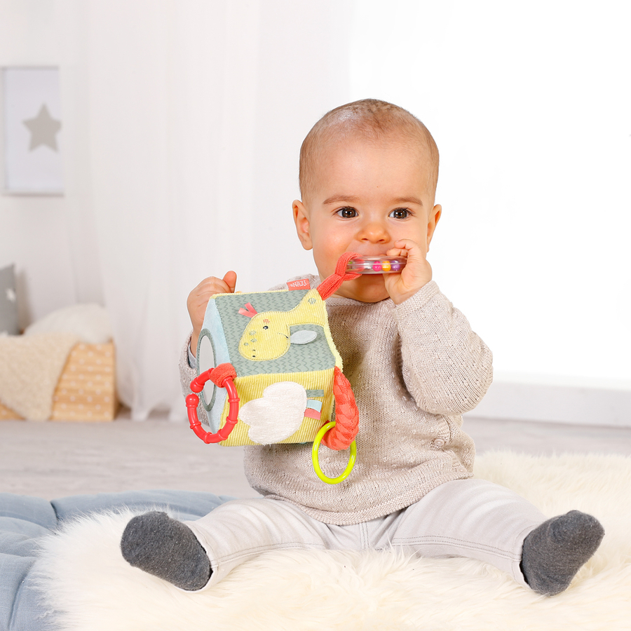 Dettagli del prodotto: Età: da 0 mesi Con sonaglio, morbido teether, specchio, campanellino, anello di presa e mix di materiali Giocattolo per la motricità con elementi di presa da appendere per lo sviluppo precoce del bambino Colori vivaci e ciondoli diversi l aden invitano al gioco e all'esplorazione Gli elementi di presa aiutano a testare il senso del tatto e della presa. Il bambino può scoprire giocosamente se stesso nello specchietto e fare rumori divertenti con il sonaglio e la campanella del versatile cubo giocattolo. Grazie al pratico anello a C, il cubo Activity può essere facilmente agganciato alla carrozzina, al seggiolino auto o al lettino. Ideale come regalo per la nascita, il battesimo o come regalo di compleanno per neonati e bambini. Dimensioni e peso: Dimensioni (lunghezza x larghezza x altezza): 10 x 10 x 10 cm Peso: 0,1 kg Materiale e cura: Materiale della tomaia: velour, tessuto stampato, velluto a coste, spugna, mussola. Imbottitura: 100% poliuretano Istruzioni per la cura: Lavare a mano Incluso nella consegna: 1 Activity - cubo Happy Dino
