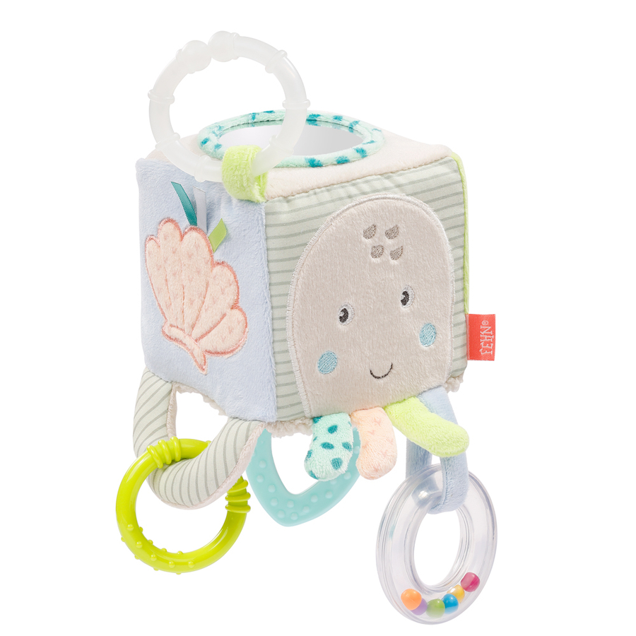 Dettagli del prodotto: Età: da 0 mesi Giocattolo per le abilità motorie con elementi di presa appesi per lo sviluppo della prima infanzia - cubo di apprendimento per neonati e bambini fin dalla nascita Con l'entusiasmante cubo gioco per l'apprendimento della collezione sea children, il bambino scoprirà giocosamente nuove cose: il sonaglio con perline, l'anello colorato da afferrare, il morbido teether, la carta scoppiettante, lo specchio e la campana offrono una varietà di possibilità di afferrare, toccare e giocare e promuovono giocosamente l'attenzione e la coordinazione occhio-mano del bambino. A casa nel lettino o in viaggio nella navicella e nella carrozzina: grazie al pratico anello a C, il versatile cubo in tessuto con animali marini può essere facilmente agganciato ovunque, diventando così il fedele compagno del bambino. Dimensioni e peso: Dimensioni da montato (lunghezza x larghezza x altezza): 10 x 10 x 10 cm Materiale e cura: Materiale: velour, tessuto stampato, boucle, tessuto a rete, poliestere Istruzioni per la cura: lavare a mano Incluso nella fornitura: 1 x fehn ® Activity -Cubo bambini mare
