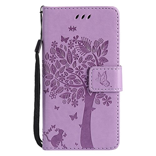 Felfy Wallet Cover Compatibile con Galaxy A5 2015 Flip Custodia in Cuoio,Chiusura Magnete Stile di Libro Anti-Graffio Copertura Protettiva con Fiore Impresso Disegno.Gatto&Albero,Viola Chiaro