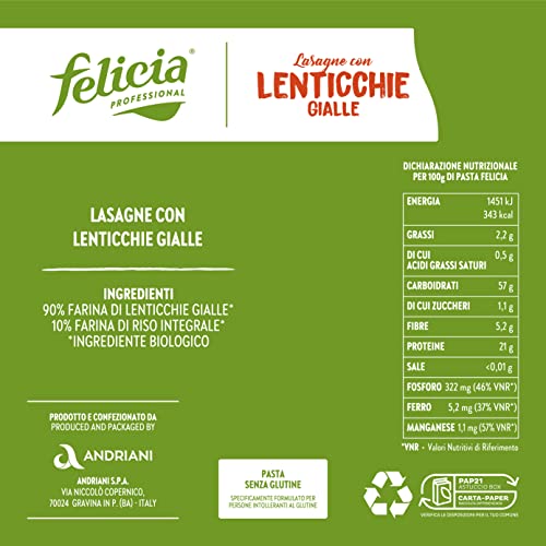 CONTENUTO - A casa riceverete una confezione di lasagne con lenticchie gialle di Felicia. Ideali per variare la propria alimentazione e perfetta anche a cena, in abbinamento a verdure di stagione, per un piatto sano, nutriente e dal gusto autentico di legumi. Ricche di proteine vegetali, di fibre e ad alto contenuto di fosforo, ferro e manganese, le lasagne con lenticchie gialle di Felicia conservano tutti i benefici dei legumi.