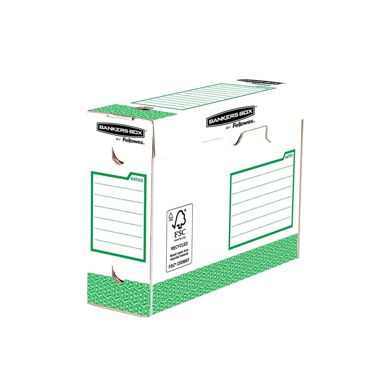 Fellowes Bankers Box Confezione base da 20 scatole portadocumenti A4+ Extra Strong 100 mm. Caratteristiche: -Scatola extra robusta per documenti A4+ (210 x 330 mm). -Area per l'etichettatura sul coperchio e sul dorso. -Realizzate in cartone riciclato al 100%, certificato FSC® e riciclabile al 100%. -Misure interne del prodotto (altezza x larghezza x profondità cm): 24 x 95 x 33. Specifiche: -Assemblaggio: manuale -Tipo di coperchio: Coperchio fisso -Colore: Bianco/Verde -CRC: 44743 -Impegnato per l'ambiente: FSC® -IMPEGNATO PER L'AMBIENTE: FSC® -Dimensioni del prodotto (A x L x P) cm: 25,30 x 10,00 x 34,50 -Riferimento: 4474302 -Peso del prodotto (Kg): 0,15 -Formato carta: A4+ -Unità per confezione: 1 -Codice a barre dell'unità: 043859720460 -Codice a barre dell'unità: 043859720460
