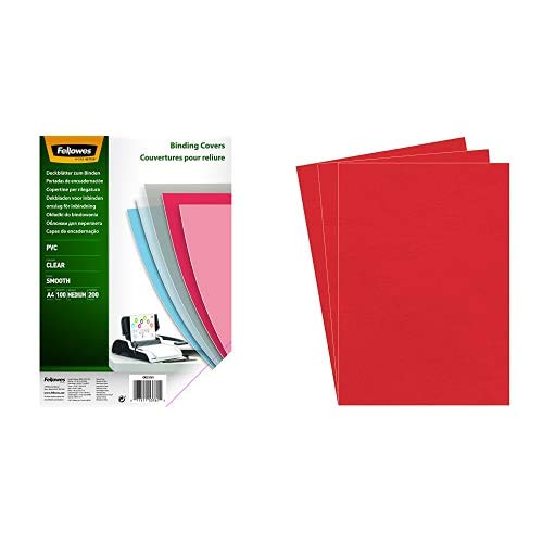 Fellowes Copertine per Rilegatrice in PVC trasparente, 200 mic, 100 Pezzi, A4 + Fellowes 5370305 Copertine per Rilegatura Delta FSC, Formato A4, Confezione da 100 Pezzi, Rosso