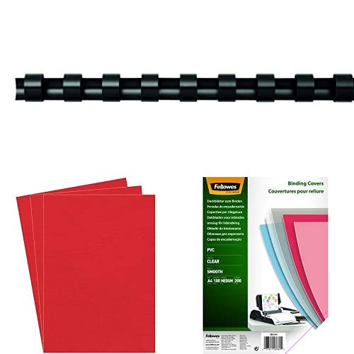Fellowes Plastic Combs- Round Back - Set di 100 Dorsi Plastici, 12 mm, Nero + Copertine per Rilegatura Delta FSC, A4, 100 Pezzi + Fellowes Copertine per Rilegatrice in PVC Trasparente, 100 Pezzi
