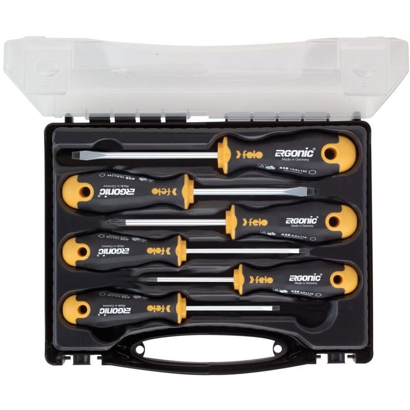 Serie 400 Cacciavite slot ergonico si adatta sempre! Più forte, più adattabile e davvero ergonomico: Ergonic è l'unica maniglia (Pat.) Che si adatta alla mano dell'utente. Mano e afferrato Interlink - Lo sforzo affonda! Ciò consente una coppia più elevata e un lavoro senza affaticamento più lungo. Core duro resistente all'impatto, resistente all'impatto, manico pratico, foro a croce per impiccare o inserire una leva, manico con la rotolamento. I neri di Special Chrome-Molibina Vanadio in lega, i migliori dati sulle prestazioni fino al 100% al di sopra dei valori ISO e DIN, punta nera per adattamento preciso 15 anni Garantisce Sicurezza testata GS
