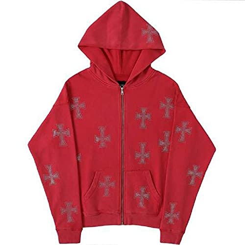 Felpa con Cappuccio da Donna con Strass Incrociati Street Fashion Sports Hip Hop Zip Up Felpa con Cappuccio Top Rosso L