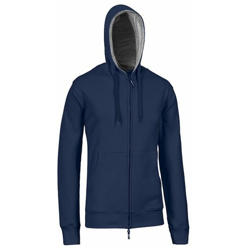65% cotone, 35% poliestere, cappuccio con interno in contrasto, elastico in vita e ai polsi, tasche a marsupio e zip a doppio cursore. Col. Blu Navy