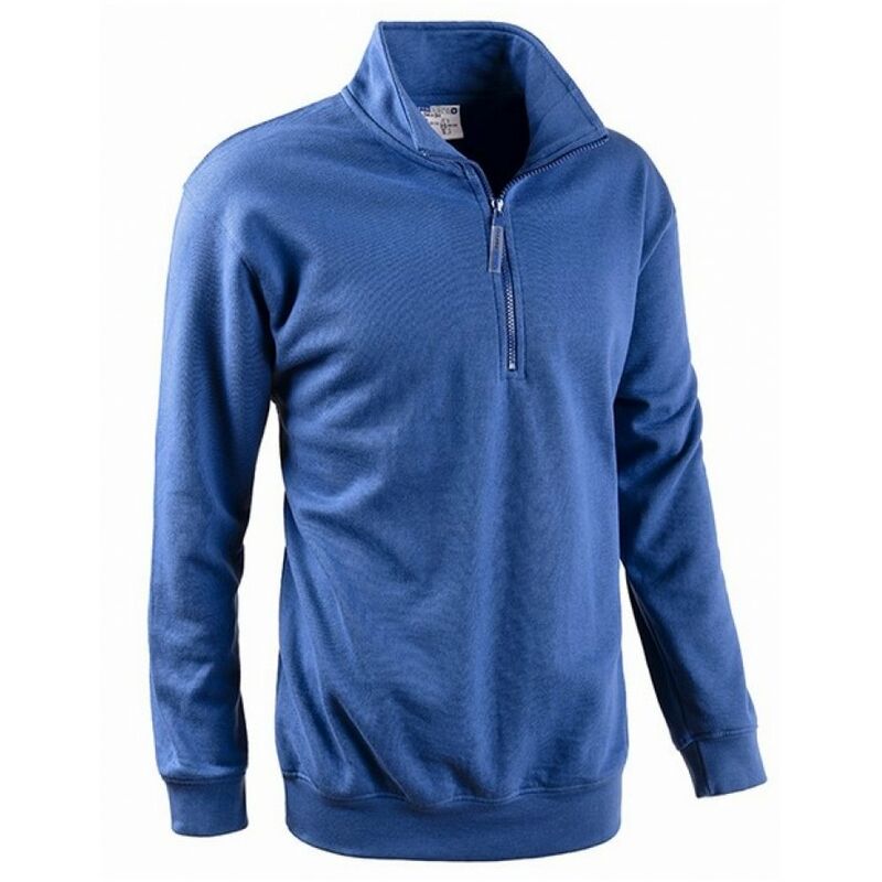 65% cotone, 35% poliestere, chiusura centrale mezza zip, fascia parasudore interna al collo, elastico ai polsi ed in vita. Col. Blu Royal
