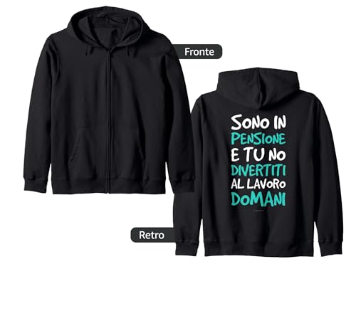 Design Felpa: Sono in pensione e tu no divertiti al lavoro domani. Felpe con cappuccio e cerniera sulla pensione con scritte divertenti e frasi originali, ironiche e simpatiche. Felpe per uomo e ragazzo.
