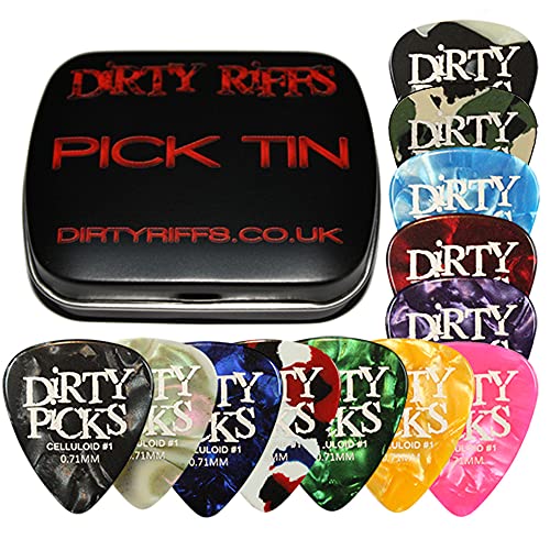 Fender, plettri in celluloide per chitarra, 12 plettri di spessore medio, 1 per ogni colore, stile 351, in una pratica scatolina di latta