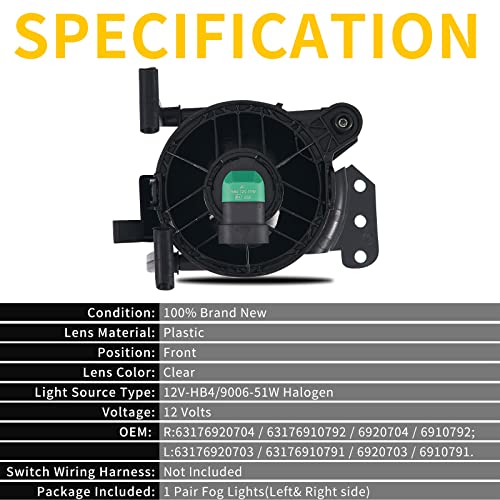 Specifiche: Lampadine 12V-HB4/9006-51W + una coppia di fendinebbia (sinistra e destra) Realizzato in materiale di alta qualità, previene l'umidità e la polvere, solido e durevole, è realizzato in plastica di alta qualità e materiale lavorato flessibile per garantire una lunga durata in condizioni esterne. Può anche migliorare la visibilità di notte, pioggia intensa, neve o nebbia fitta.