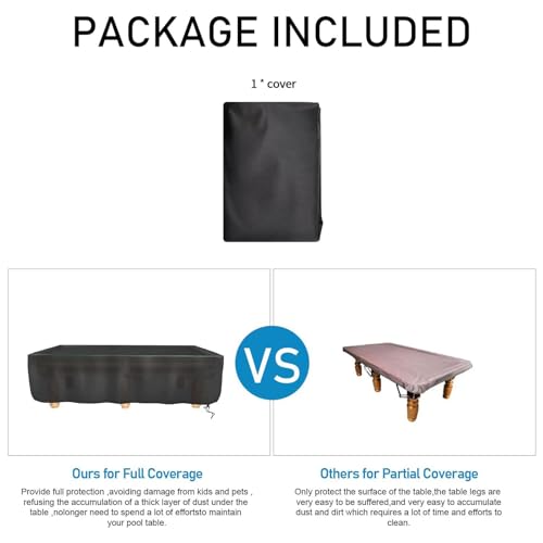 Materiale durevole: le nostre coperture per tavoli da biliardo sono realizzate in tessuto Oxford ad alta densità con rivestimento argentato che riduce i danni del tavolo da biliardo causati da acqua/vento/neve/strappi e resistenza ai raggi UV, mantenendo il tavolo da biliardo ancora pulito.