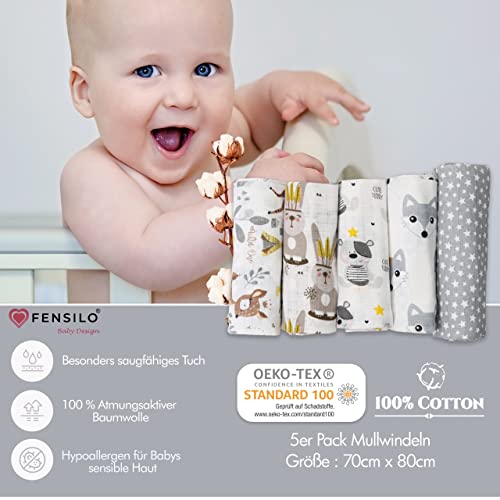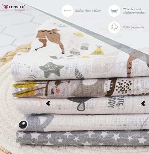 FENSILO Salviette per bambini - panni di garza - pannolini di stoffa - confezione da 5 pezzi 70 x 80 cm Made in EU - testati contro le sostanze nocive - Panni per bambini e bambine con lupo & coniglio