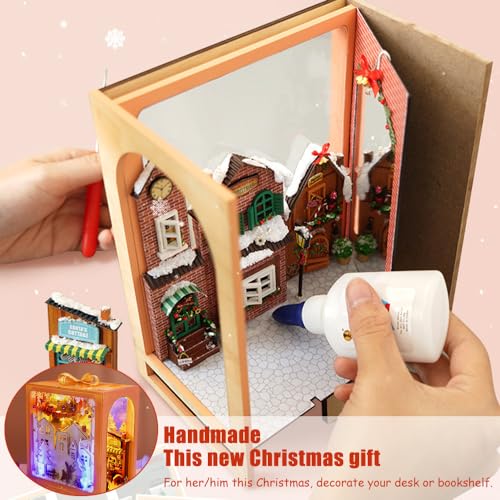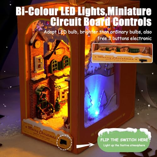 [Tema natalizio]: il DIY book nook kit fai da te è realizzato con un tema natalizio, con squisiti elementi natalizi, offrendo un'esperienza fantastica. Utilizza sagome di copertina blu e scene di strada tridimensionali natalizi arancione caldo per aggiungere un aspetto misterioso e meravigliosa atmosfera natalizia.