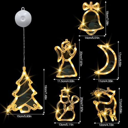 【6 diversi modelli di luci natalizie a ventosa】Lampada a ventosa per natale fornisce 6 classici stili di elementi natalizi di cervo + campana + albero di Natale + angelo + pupazzo di neve + stella a cinque punte. La calda luce bianca ti regala una calda sensazione natalizia e aggiunge un'atmosfera gioiosa.
