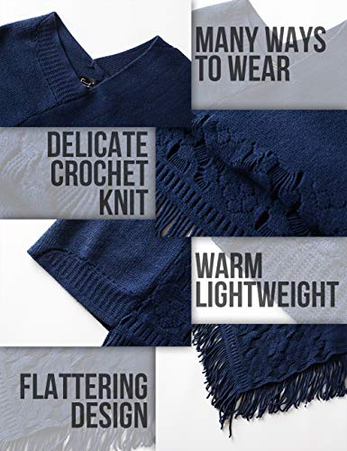Ferand Elegante Poncho Donna Mantella Scialle Uncinetto con Franges - Taglia Unica - Blu Navy