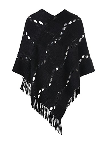 Ferand Poncho con Buchi Frange Lavorato a Maglia Scialle Incavato Giovani Ragazze Autunno Primavera per Donna, Nero