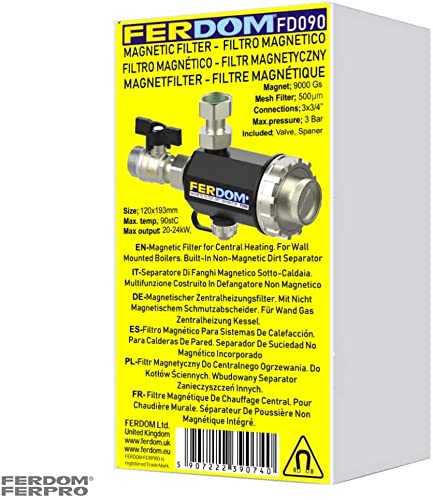 FERDOM FD090 Filtro Defangatore Magnetico Sottocaldaia. Multifunzione. Costruito In Defangatore Non Magnetico. Dimensioni Compatte, Flessibilità Di Connessione. Magnete 9000 Gs, Filtro 500 Micron.