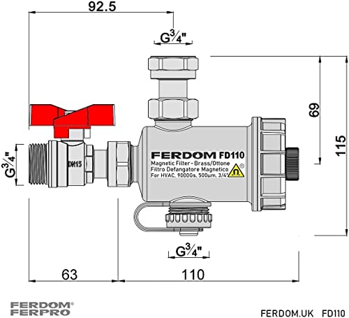 FERDOM FD110 Filtro Defangatore Magnetico Sottocaldaia. Multifunzione. Costruito In Defangatore Non Magnetico. Dimensioni Compatte, Flessibilità Di Connessione. Magnete 9000 Gs, Filtro 500 Micron.