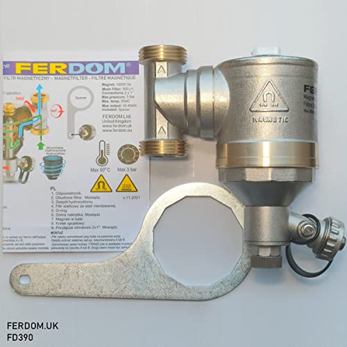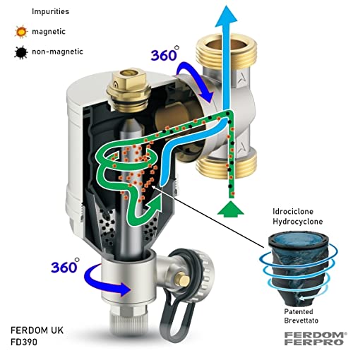 FERDOM FD390 STRONG 1" (DN25) Filtro Magnetico/Idrociclone Per Sistemi Di Riscaldamento. Magnete 10000gs. Con Separatore Di Particelle Non Magnetiche Inox 500µm. Max.40kW. Rac.360 Gradi. 100% Ottone