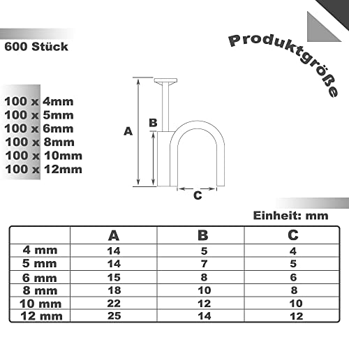 Fermacavo con Chiodo, Graffetta Fermacavo per la Gestione e il Fissaggio dei Cavi, 4, 5, 6, 8, 10 e 12 mm, 600 Pezzi