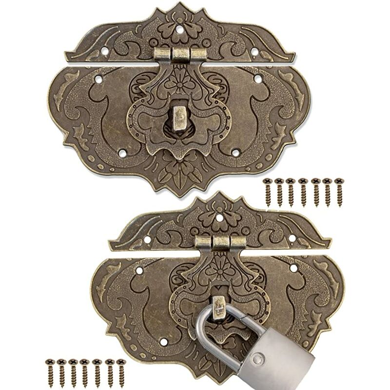 Set di 2 serrature per cassapanche, scatole, credenze in bronzo antico design Ideale per l'utilizzo con un lucchetto (diametro foro: 4,5 mm) Perfetto per il restauro di vecchie cassapanche, mobili o da ristrutturare in una vecchia casa di campagna, mobili rustici, design di castelli Viti per legno abbinate incluse