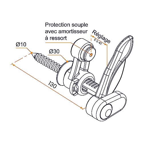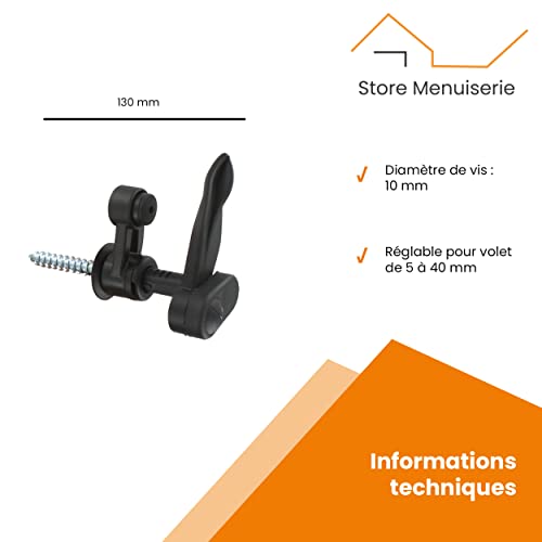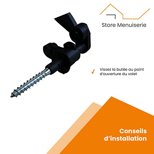 Dimensioni: lunghezza: 130 mm. Spessore: da 5 a 40 mm. Diametro di foro: 10 mm. Fermaporta in composito nero con fermata ammortizzante per persiane e persiane, in legno, PVC o alluminio. Fabbricazione francese.