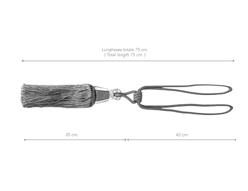 Sono dotate di cordone intrecciato lungo 40 cm. in tinta delle stesso colore che serve a raccogliere la tenda e la nappa di misura cm. 35. In totale quindi 75 cm. Misure generose in modo da avvolgere le tende a tuo piacimento. Per le misure fate riferimento alla illustrazione.