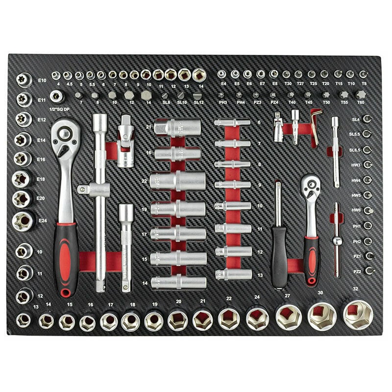 4 moduli contenenti: - Set 108 pezzi,bussole esagonali e torx e inserti att. 1/4 e 1/2" - set 17 pezzi chiavi combinate: 6 - 7 - 8 - 9 - 10 - 11 - 12 - 13 - 14 - 15 - 16 - 17 - 18 - 19 - 20 - 21 - 24 mm - Set 8 pezzi chiavi anello doppie: 6x7 - 8x9 - 10x11 - 12x13 - 14x15 - 16x17 - 18x19 - 20x22 mm - Set 6 cacciaviti taglio: 3x100 mm, 5x75 mm, 6x100 mm - 8x150 mm, 10x200 mm, 6x38 mm;