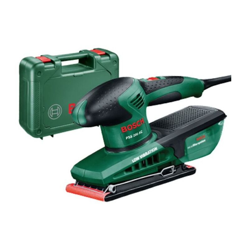 Potenza 200 Watt, piastra di levigatura 92x182 mm., no oscillazioni 24.000 giri/min., oscillazioni 2,0 mm., fissaggio foglio a staffa, rivestimento Softgrip, aspirazione polvere integrata con sistema Microfilter. Dotazione: foglio abrasivo, valigetta