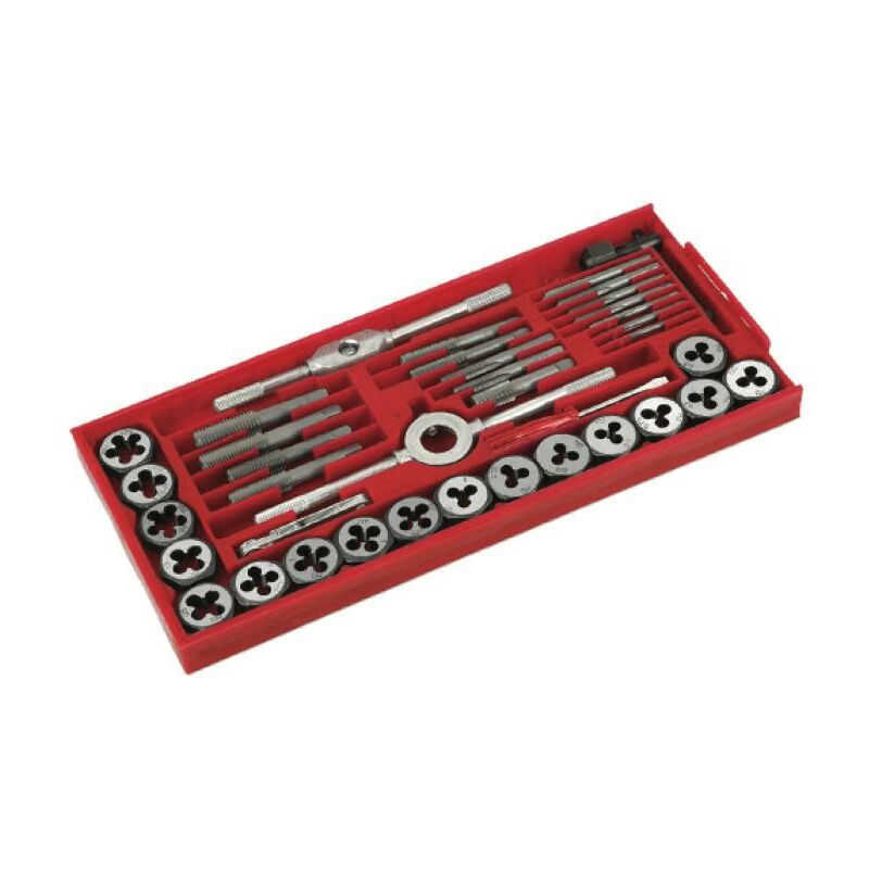 Assortimento in cassetta di plastica di maschi e filiere in acciaio utensile e di accessori