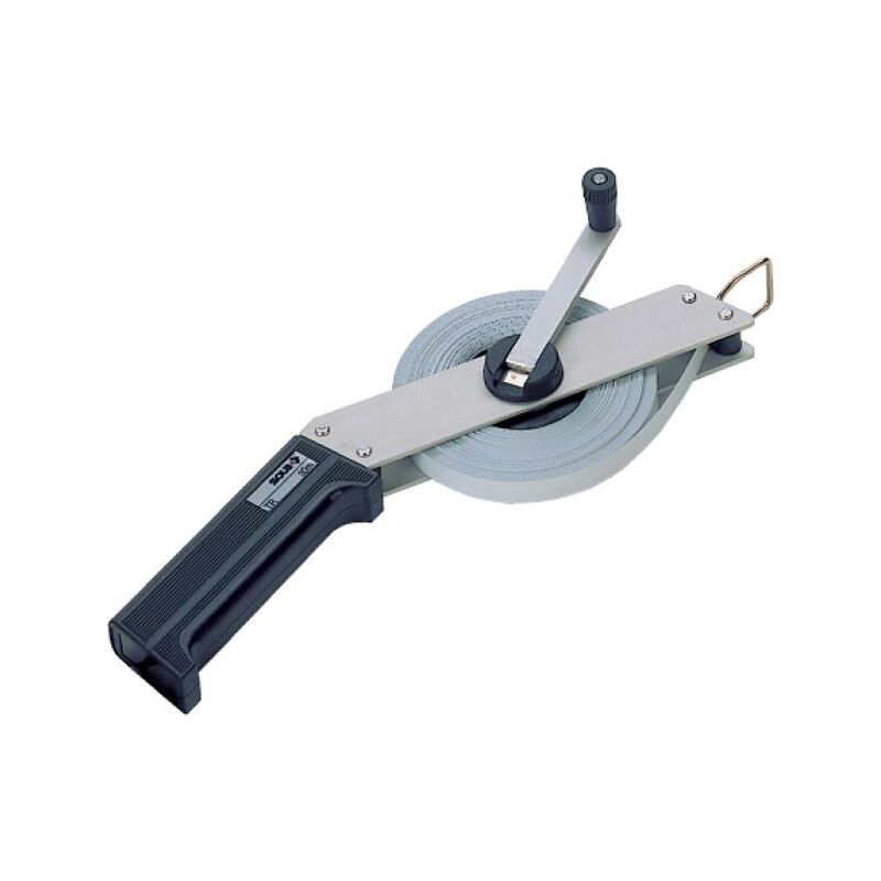 Struttura in alluminio ad I - manopola in ABS - nastro in acciaio rivestito in poliestere bianco - struttura centrale in nylon con fibra di vetro per un agevole riavvolgimento - manopola di riavvolgimento ed impugnatura ergonomica, gancio finale resistente all'usura con uncino in acciaio inox, lunghezza 50 mt.