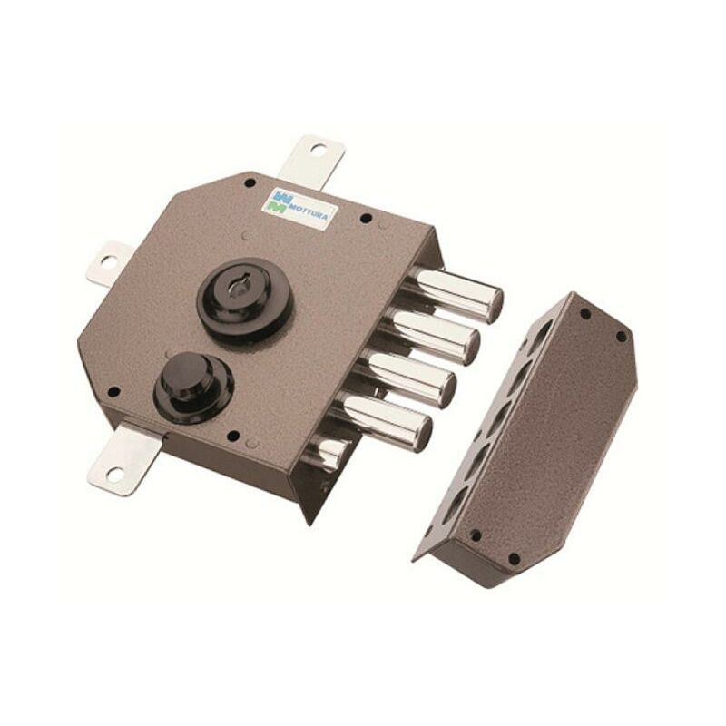 Serratura quintuplice da applicare con scrocco, 4 mandate, cinque punti di chiusura, cilindro a gorges 30, corsa chiavistelli mm. 40, corsa aste 17 mm., entrata 60 mm., apertura interna con chiave - pompa singola esterna. Aste e deviatore non in dotazione