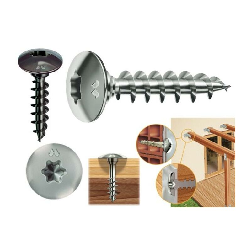 Vite zincata lubrificata con trattamento Chromiting con cava Torx specifica per il fissaggio di elementi di ferramenta per costruzioni in legno e per l'assemblaggio di strutture in legno. La testa larga a forma di fungo consente una forte pressione di serraggio e copertura del foro il collare sottotesta ha la funzione di centraggio del foro e di tenuta assiale