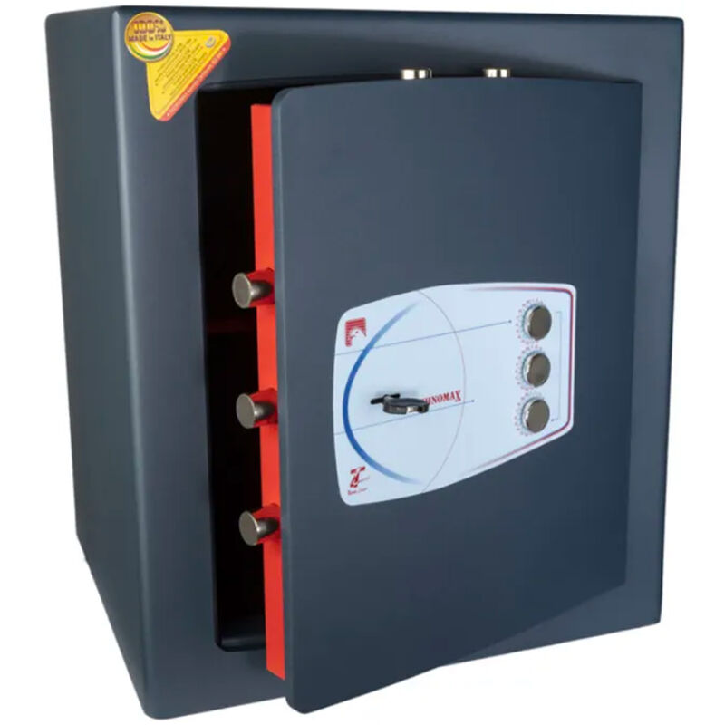 Cassaforte a mobile Technomax serie “Gold moby diplo” modello GMD/7 Serratura di alta sicurezza di ultima generazione, con 8 leve asimmetriche ed indipendenti, certificata UNI EN 1300. Si basa sull'utilizzo di nuove leve antipicking oscillanti e mentonnet a profilo speciale che oppongono una eccezionale resistenza agli attacchi portati utilizzando gli ultimi sofisticati sistemi di manipolazione con l'uso di speciali grimaldelli Chiave a doppia mappa con profilo speciale duplicabile con carta di proprietà, per impedire la duplicazione non autorizzata delle chiavi Blocco combinatore a 3 volantini da 20 posizioni ciascuno Estrazione della chiave impossibile a catenacci rientrati Catenacci in acciaio nichelato, girevoli, del Ø di 22 mm Protezione al meccanismo della serratura con piastra in acciaio al manganese Catenacci orizzontali e verticali superiori protetti da una piastra in acciaio al manganese dello spessore di 3 mm., posizionata in obliquo al fine di ottenere la massima
