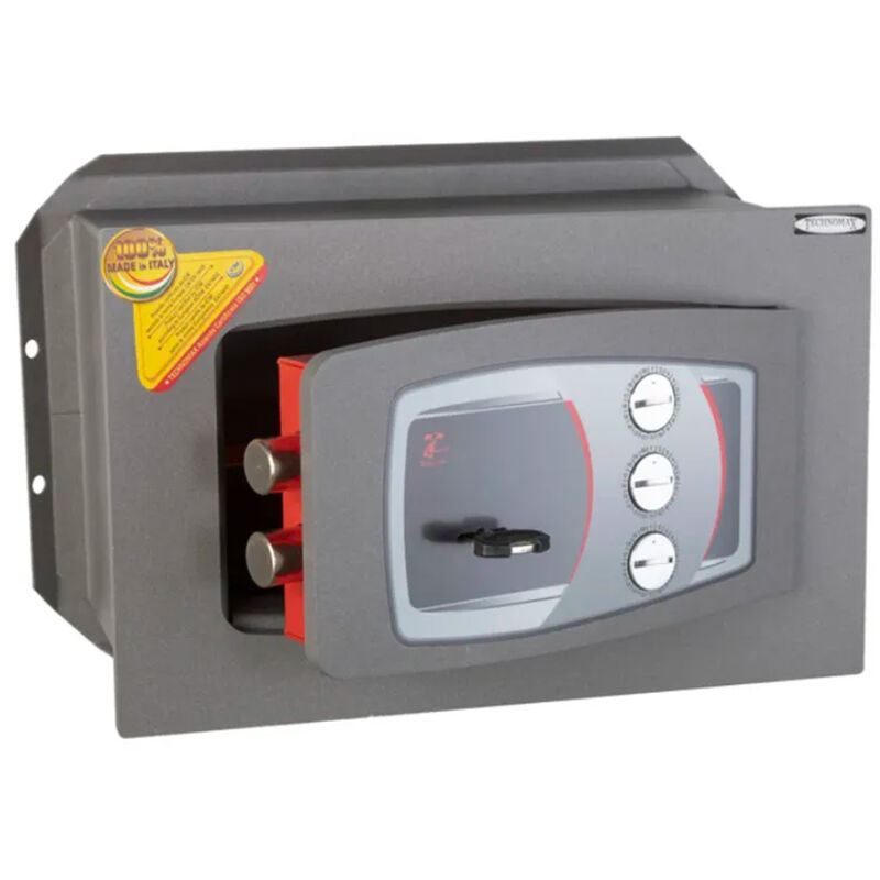 Cassaforte a muro Technomax della serie “Technofort Diplo”, modello DD/3B Cassaforte con apertura con chiave a doppia mappa + combinatore a 3 volantini Caratteristiche tecniche: Serratura di alta sicurezza di ultima generazione, con 8 leve asimmetriche ed indipendenti, certificata UNI EN 1300, si basa sull'utilizzo di nuove leve antipicking oscillanti e mentonnet a profilo speciale che oppongono una eccezionale resistenza agli attacchi portati utilizzando gli ultimi sofisticati sistemi di manipolazione con l'uso di speciali grimaldelli Chiave a doppia mappa con profilo speciale duplicabile con carta di proprietà, per impedire la duplicazione non autorizzata delle chiavi Blocco combinatore a 3 volantini incassati da 20 posizioni ciascuno. Estrazione della chiave impossibile a catenacci rientrati Catenacci in acciaio nichelato, girevoli, del diametro di 22 mm Protezione al meccanismo della serratura con piastra in acciaio al manganese Speciali battute della porta per resistere più a