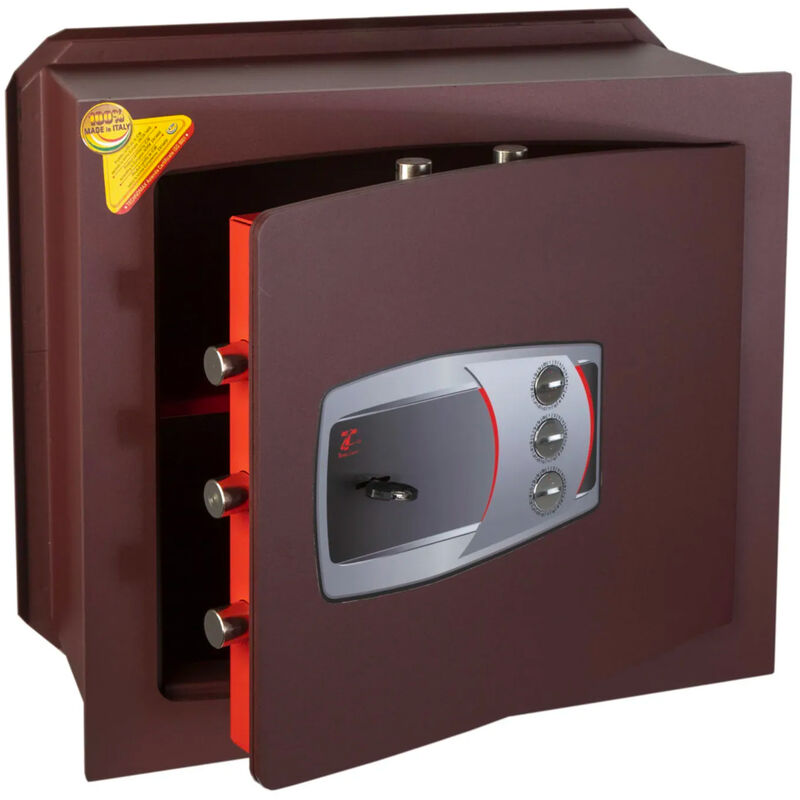 Cassaforte a muro della Technomax della serie “Master diplo” modello DM/6L Caratteristiche Techniche: Serratura di alta sicurezza di ultima generazione, con 8 leve asimmetriche ed indipendenti, certificata UNI EN 1300. Si basa sull'utilizzo di nuove leve antipicking oscillanti e mentonnet a profilo speciale che oppongono una eccezionale resistenza agli attacchi portati utilizzando gli ultimi sofisticati sistemi di manipolazione con l'uso di speciali grimaldelli es”attrezzo bulgaro”. Chiave a doppia mappa con profilo speciale duplicabile con carta di proprietà, per impedire la duplicazione non autorizzata delle chiavi. Blocco combinatore a 3 volantini incassati da 20 posizioni ciascuno. Estrazione della chiave impossibile a catenacci rientrati. Catenacci in acciaio nichelato, girevoli, del Ø di 22 mm. Protezione al meccanismo della serratura con piastra in acciaio al manganese. Speciali battute della porta per resistere più a lungo ai tentativi di effrazione con mazza. Robuste