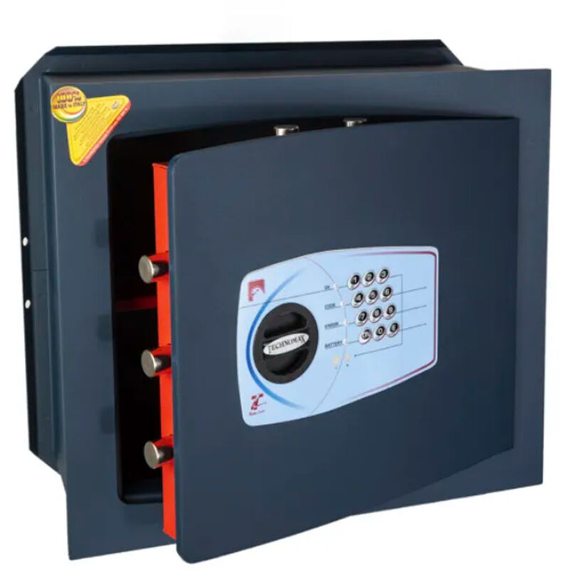 Cassaforte a muro Technomax “GOLD TRONY” modello GT/6LP Caratteristiche: Spessore frontale e porta 10 mm. Serratura certificata UNI EN 1300 controllata da un congegno elettronico ad alta affidabilità, dotato di memoria permanente Apertura/chiusura con manopola di comando e blocco con elettromagnete. Alimentazione interna con batterie alcaline (non incluse). Tastiera a membrana con 4 leds dedicati. Contatti per batteria esterna ricavati direttamente sulla tastiera. Segnalazioni sonore e visive per conferma digitazione, errori e batterie interne in fase di esaurimento. Catenacci in acciaio nichelato, girevoli, del Ø di 22 mm (GT/1 - GT/2 - GT/3B - GT/3 Ø 18 mm fissi). Protezione al meccanismo della serratura con piastra in acciaio al manganese. Speciali battute della porta per resistere più a lungo ai tentativi di effrazione con mazza. Robuste saldature interne realizzate con sistema robotizzato. Saldatura perimetrale del frontale al corpo realizzata in continuo con sistema robotizzato.