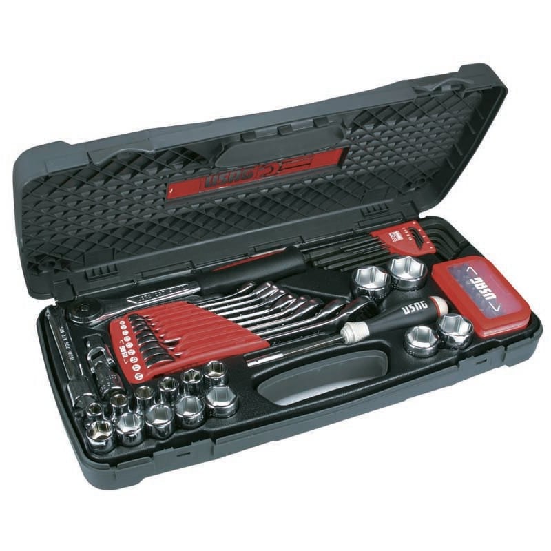 Kit di chiavi originali USAG per la manutenzione e un pratico primo intervento con bussole esagonali attacco da 1/2, inserti per avvitatori e chiavi combinate Dotazione: 9 chiavi maschio esagonali Ø 1,5 - 10 15 chiavi a bussola esagonali Ø 10 - 32 5 inserti per viti ad intaglio 5 inserti per viti con impronta PHILLIPS 5 inserti per viti con impronta POZIDRIV 7 inserti per viti con esagono incassato 9 inserti per viti con impronta TORX 9 chiavi combinate 8 ÷ 19 1 cricco con snodo e prolunga Valigetta