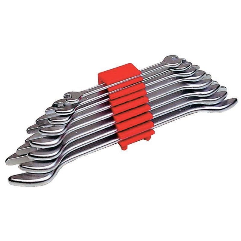 In acciaio al cromo-vanadio, sottili, esecuzione cromata. Serie di 13 chiavi: (6x7) - (8x9) - (10x11) -( 12x13) -(14x15) - (16x17) - (18x19) - (20x22) -(21x23) - (24x26) - (25x28) - (27x29) - (30x32) mm Dotazione: Serie di chiavi Supporto di plastica