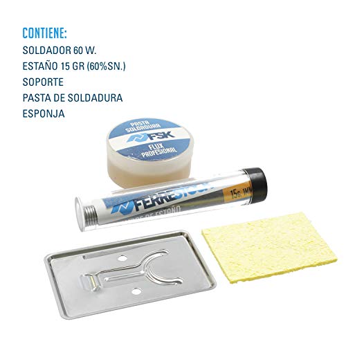 Ferrestock FSKSOL160KIT Saldatore elettrico tipo matita da 60 W, tubo con 15 g di filo di stagno da 1 mm, pasta di saldatura, supporto metallico e spugna pulente