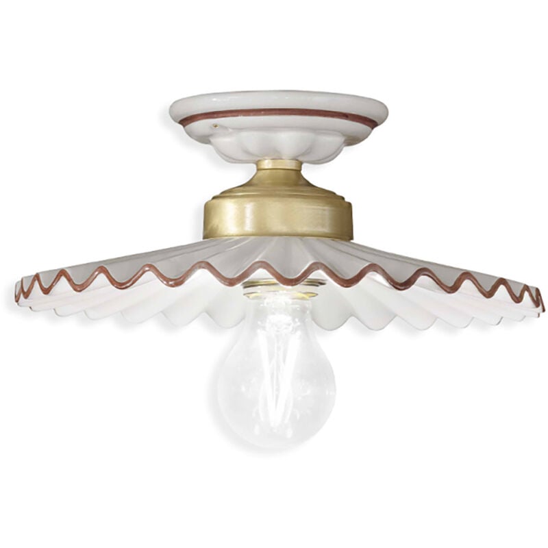 Collezione Classic L'Aquila LINEE PLISSETTATE CHE RIEVOCANO LEGGIADRIA Plafoniera 1 Luce E27 diametro 23 cm in ceramica decoro Filo Marrone con montatura Ottone Satinato frutto di una lavorazione eseguita rigorosamente a mano secondo le tecniche artigianali di una volta. Diffusori plissettati in ceramica dai profili dipinti a mano evidenziano la maestria degli artigiani che si dedicano a preservare tradizioni antiche che non lasciano nulla al caso. Una linea che si presta ad arredare non solo gli ambienti domestici ma anche locali pubblici dallo stile classico o country. Per la vostra casa in montagna questa plafoniera dal diffusore plissettato può completare l'arredamento della cameretta o della mansarda. E' possibile scegliere il decoro in base ai propri gusti. E' disponibile anche nei colori Argento, Bianco, Bianco Sfumato Argento,Bianco Sfumato Oro, Nero, Nero Sfumato Argento, Nero Sfumato Oro, Nero Sfumato Rame, Ruggine, Verde Sfumato Oro, Ottone Brunito.