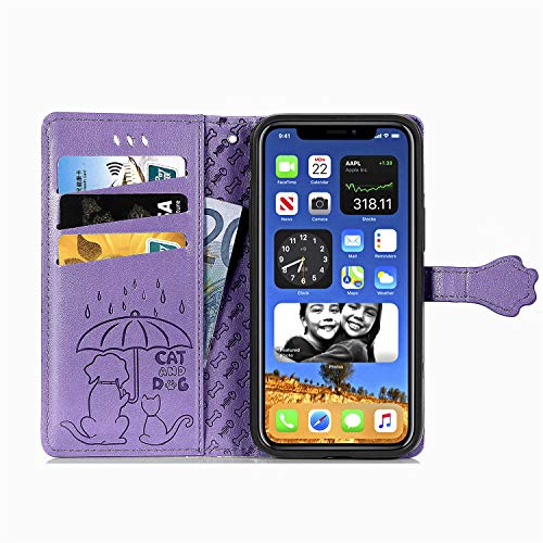 Fertuo Cover per iPhone 12 Pro/iPhone 12, Custodia Portafoglio a Libro in Pelle Flip Cover con Porta Carte, Chiusura Magnetica [Disegni di Gatto Cane] Case Antiurto per iPhone 12 Pro, Viola