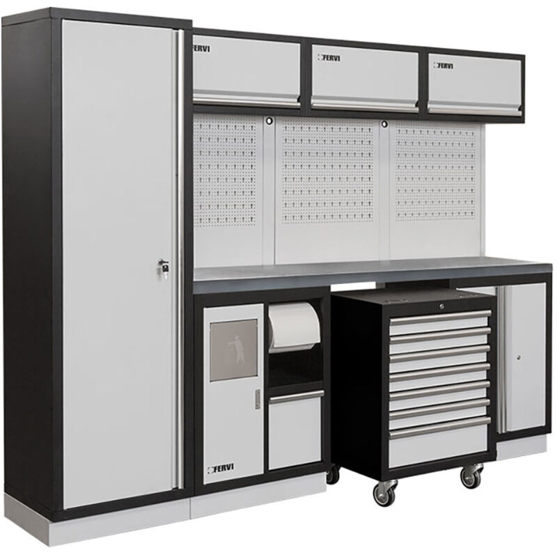FERVI A008E ARREDAMENTO MODULARE PER OFFICINA CON PIANALE IN ACCIAIO INOX LA SOLUZIONE OTTIMALE PER ARREDARE LA TUA OFFICINA, IL TUO GARAGE O IL TUO ANGOLO RACING Dimensioni: 2640 x 498 x 2000h mm ACCESSORI INCLUSI NEL PREZZO: 3 ARMADI PENSILI CON AMMORTIZZATORI A GAS (A007/01) 1 ARMADIO ALTO CON 3 PIANI INTERNI (A007/02) 1 ARMADIO BASSO A 2 ANTE CON 1 PIANO INTERNO (A007/03) 1 ARMADIO BASSO MULTIFUNZIONE (A007/06) 3 PROFILI DI GIUNZIONE PER PANNELLI FORATI (A007/07) 1 PIANO IN ACCIAIO INOX (A007/09I) 3 PANNELLI FORATI (A007/10) 1 ARMADIO A 2 ANTE CON UN PROFILO PER PANNELLI FORATI (A007/11) 1 CASSETTIERA A CARRELLO CON 7 CASSETTI SU CUSCINETTI (A007/16)