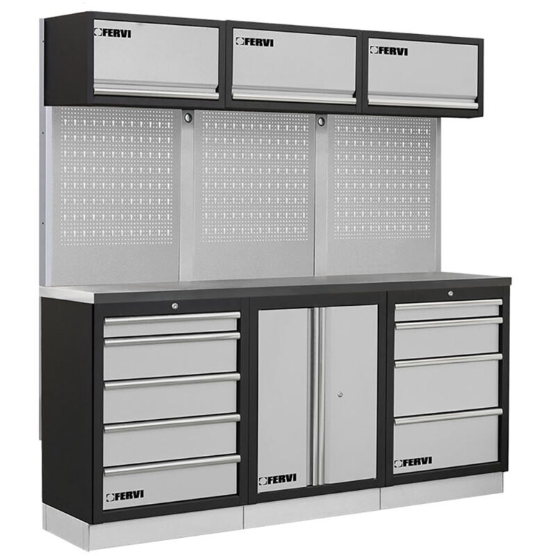 FERVI A008N ARREDAMENTO MODULARE PER OFFICINA CON PIANALE IN ACCIAIO INOX LA SOLUZIONE OTTIMALE PER ARREDARE LA TUA OFFICINA, IL TUO GARAGE O IL TUO ANGOLO RACING Dimensioni: 2040 x 498 x 2000h mm ACCESSORI INCLUSI NEL PREZZO: 3 ARMADI PENSILI CON AMMORTIZZATORI A GAS (A007/01) 1 ARMADIO BASSO A DUE ANTE CON UN PIANO INTERNO (A007/03) 1 CASSETTIERA A 4 CASSETTI SU CUSCINETTI (A007/04) 1 CASSETTIERA A 5 CASSETTI SU CUSCINETTI (A007/05) 3 PROFILI DI GIUNZIONE PER PANNELLI FORATI (A007/07) 1 PIANO IN ACCIAIO INOX (A007/09I) 3 PANNELLI FORATI (A007/10) 2 PROFILI PER PANNELLI FORATI (A007/11)
