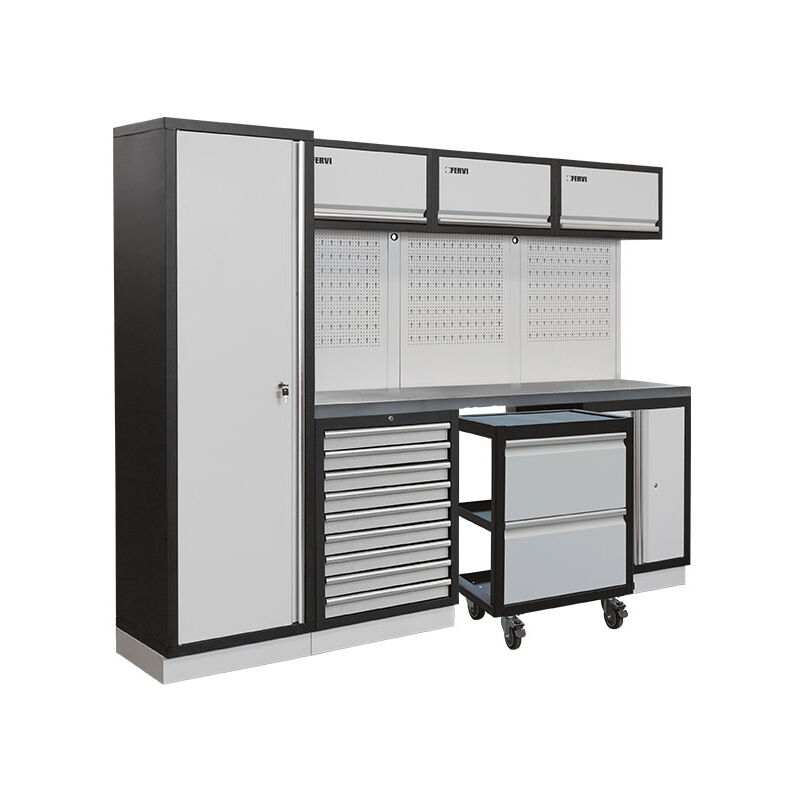 FERVI A008S ARREDAMENTO MODULARE PER OFFICINA CON PIANALE IN ACCIAIO INOX LA SOLUZIONE OTTIMALE PER ARREDARE LA TUA OFFICINA, IL TUO GARAGE O IL TUO ANGOLO RACING Dimensioni: 2640 x 498 x 2000h mm ACCESSORI INCLUSI NEL PREZZO: 3 ARMADI PENSILI CON AMMORTIZZATORI A GAS (A007/01) 1 ARMADIO ALTO CON 3 PIANI INTERNI (A007/02) 1 ARMADIO BASSO A 2 ANTE CON 1 PIANO INTERNO (A007/03) 3 PROFILI DI GIUNZIONE PER PANNELLI FORATI (A007/07) 1 PIANO IN ACCIAIO INOX (A007/09I) 3 PANNELLI FORATI (A007/10) 1 PROFILO PER PANNELLI FORATI (A007/11) 1 CASSETTIERA CON 9 CASSETTI (A007/20) 1 CARRELLO A 3 RIPIANI (A007/22)