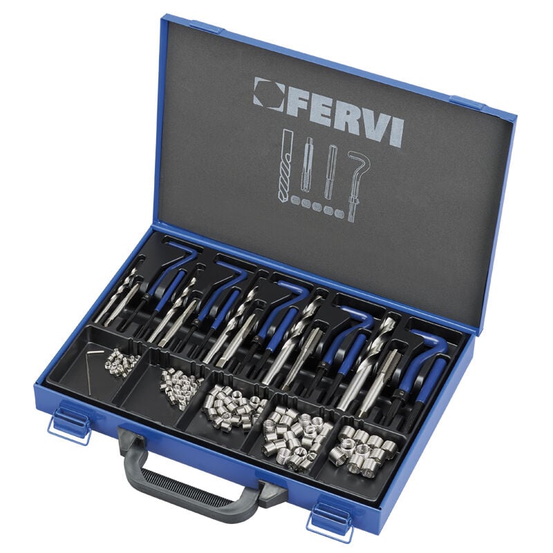 KIT SET ASSORTIMENTO RIPARAZIONE RIPRISTINA FILETTI HELICOIL FERVI E010 RIPARA FILETTI DANNEGGIATI M5-M6-M8-M10-M12 Composizione del kit Manici a “T” 5 Pz /5 Pcs Filetto M5=25 M6=25 M8=25 M10=25 M12=10 Maschi xM5=1 xM6=1 xM8=1 xM10=1 xM12=1 Punte 5,2=1 6,3=1 8,3=1 10,4=1 12,4=1 mm