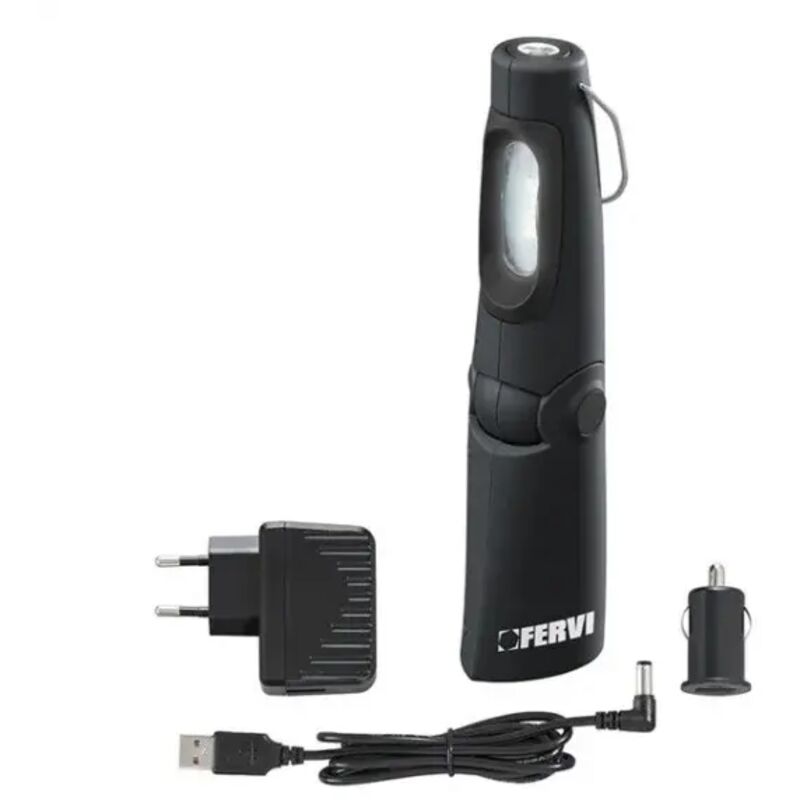 LAMPADA TORCIA A LED RICARICABILE MAGNETICA FERVI 0889 Lampada portatile con led bianchi ad alta luminosità, con 2 interruttori per l' accensione dei LED della parte anteriore e quelli della parte inferiore. Il modello dispone di carica batterie da collegare all' alimentazione di rete a 230V e il carica batterie da collegare all' apposita presa in auto. Pieghevole, appendibile e magnetica. Caratteristiche tecniche: Batteria: 3,7 V - 1100mAh - Lithium LED: 21 + 5 - 9000 mcd Tempo di ricarica: 4 ÷ 5 h Autonomia: 4 ÷ 6 h Carica batterie AC/DC: 230V 50Hz / 3,7V Adattatore DC/DC: 12V / 3,7V